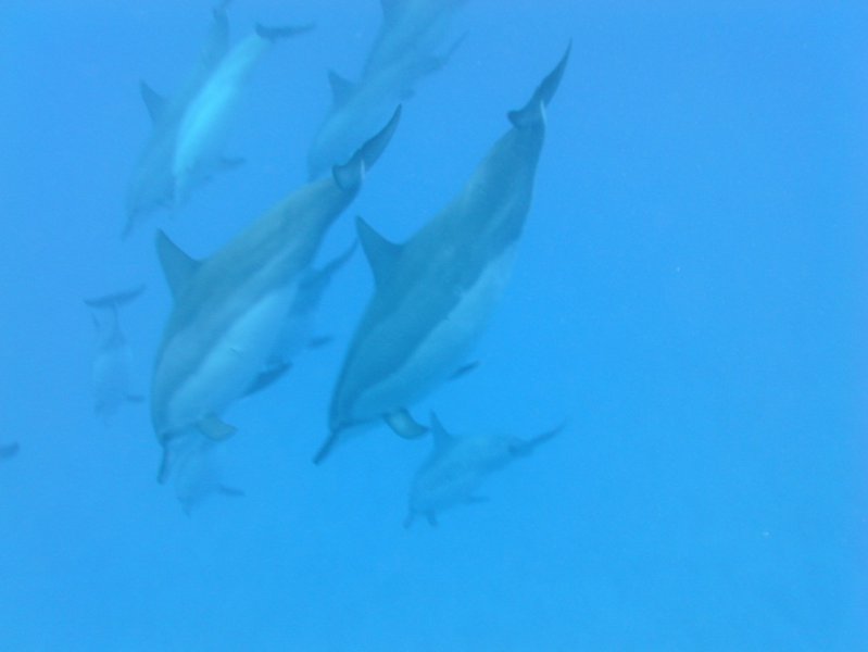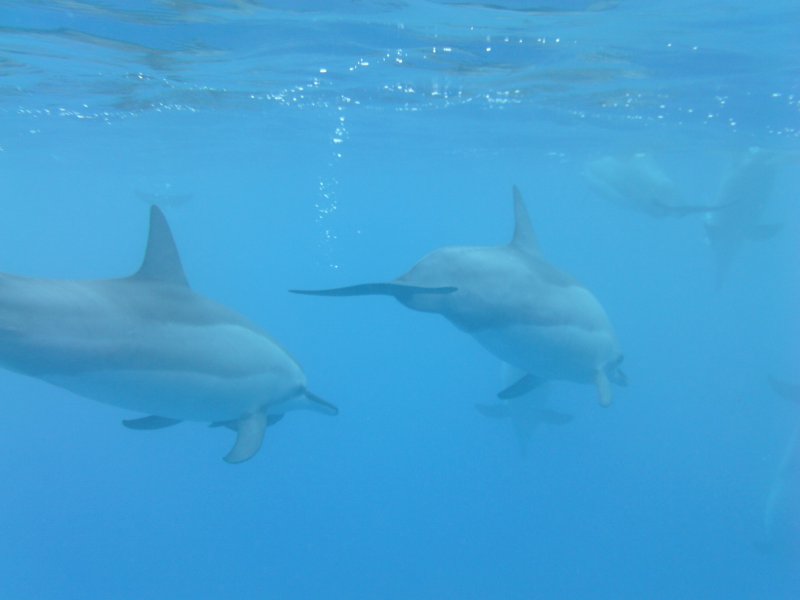 Außerdem zog es uns natürlich in Hawaii auch ins Wasser. Da Elena schon seit Neuseeland herumnörgelte mit den Delphinen schwimmen zu gehen und wir dies dort aufgrund des kalten Wassers doch lieber nicht machen wollten stand dies nun in Hawaii auf dem Programm. Dazu mussten wir um 5 Uhr morgens aufstehen, über die komplette Insel fahren und einen nicht zu nennenden höheren Betrag entrichten der locker für mehrere Tauchgänge gereicht hätte. Dafür erhielten wir unvergessliche Eindrücke mit den Delphinen und ein Mehrtagespensum an Sport denn die Viecher schwimmen gerne davon und dann hieß es hinterher… 1,5 Stunden am Stück….